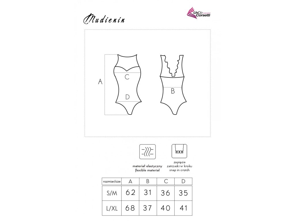 Body Mudienin - saténové body s krajkou - na předním díle přechází krajka z dekoltu do pasu - rozepínání v rozkroku na 3 patenty Materiálové složení: 88% polyester, 12% elastan