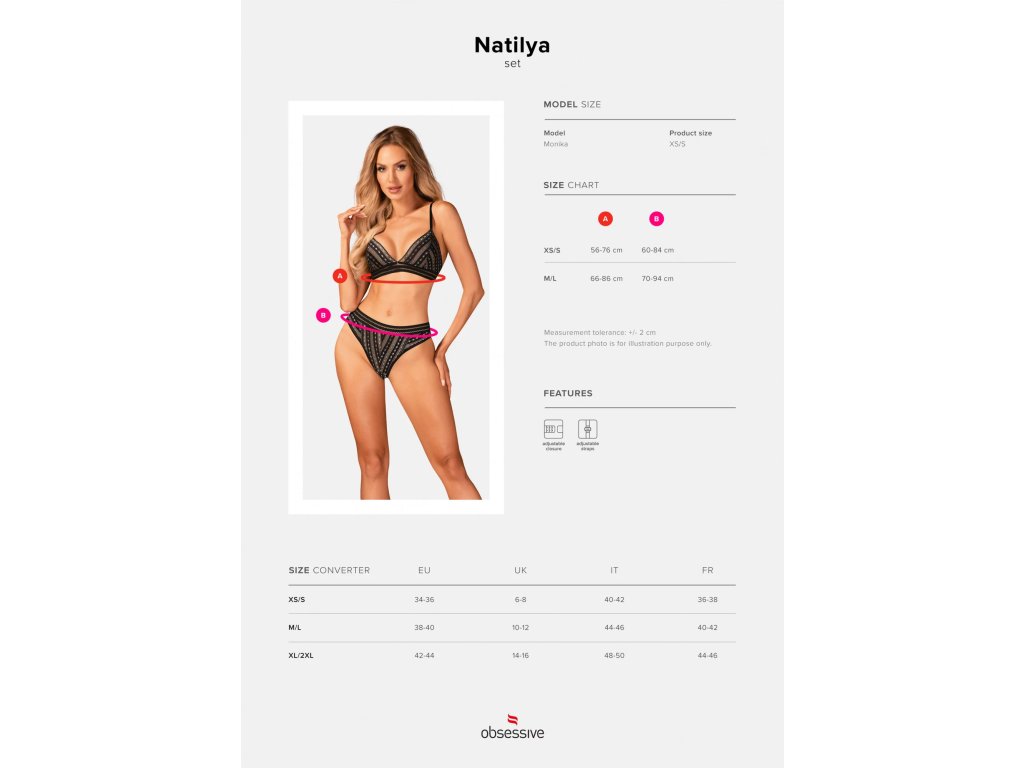 Sada NatilyaSvůdný ženský střih a jedinečný vzor z měkkých materiálů - souprava Natilya je mimořádně sexy a klasická. Podprsenka s trojúhelníkovým košíčkem zajistí plné pohodlí a kalhotky zdobené smyslným střihem na hýždích rozproudí fantazii a povzbudí vás k prožití slastných chvil v ložnici. Přesvědčte se sami a nebudete litovat!