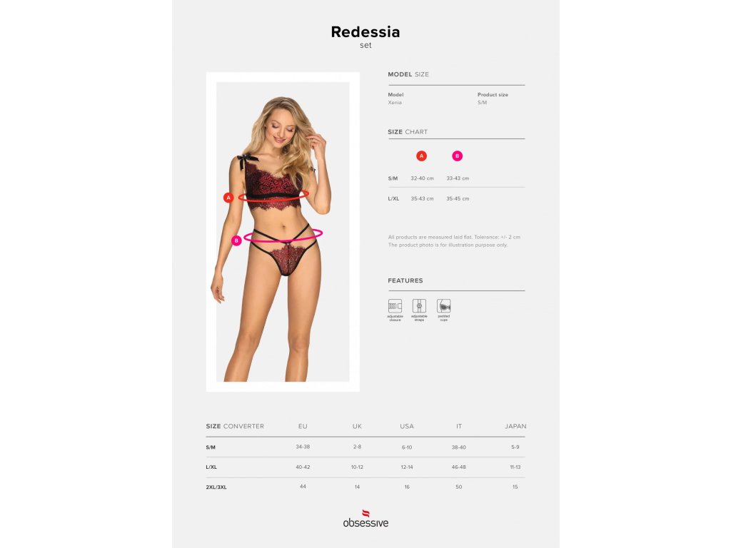 Máte před sebou romantický večer se svým milým a netušíte, čím ho překvapit? Podívejte se na soupravu Redessia: svůdná krajka, saténové mašličky a elastická ramínka, která dokonale zdůrazní boky. Předpokládáme, že jste sami nečekali, že byste se mohli tak rychle zamilovat, že? Nyní věnujte pozornost sexy kombinaci černé a červené, fenomenálnímu květinovému vzoru a řasené krajce, která dotváří okraje. Redessia si ukradla vaše srdce v hravém stylu...