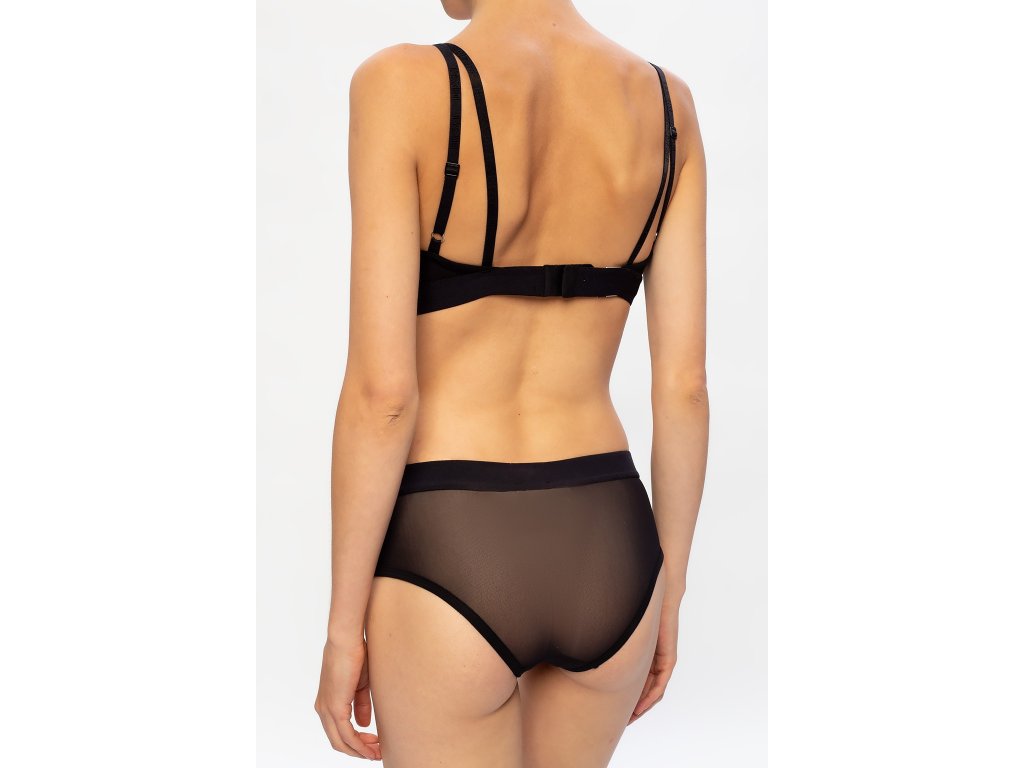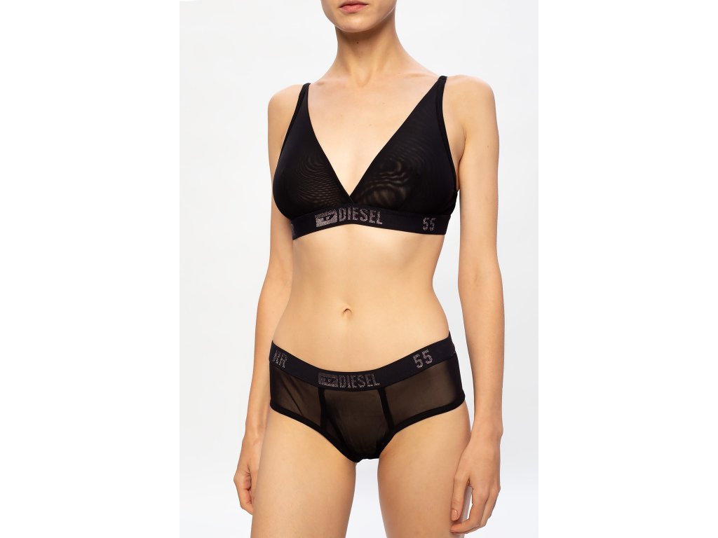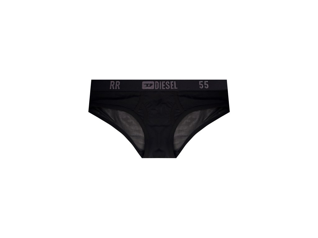 Černé kalhotky od Diesel. Tento pár je vyroben z poloprůhledné síťoviny a má elastický pas zdobený logem štítku vyšívaným stříbrnou lurexovou přízí.