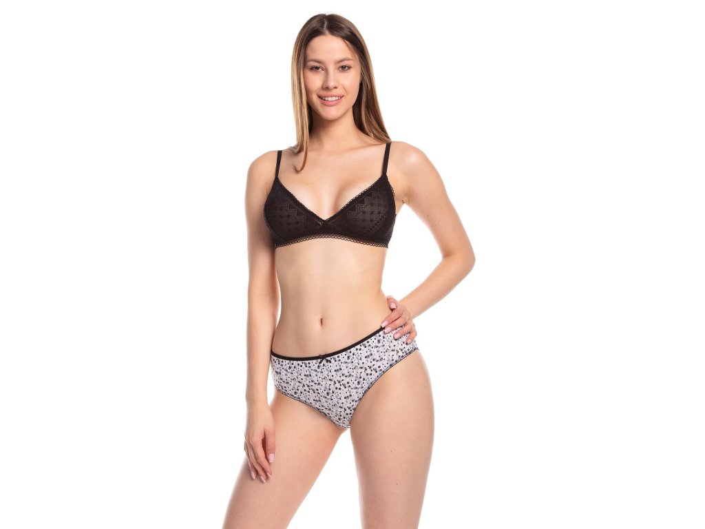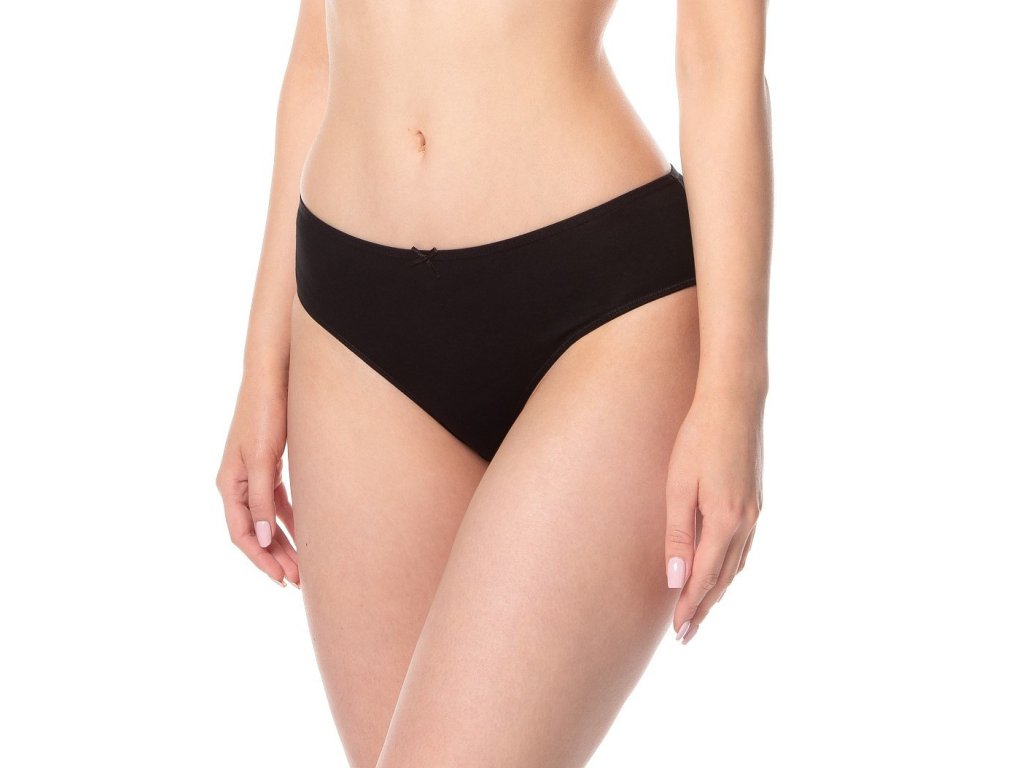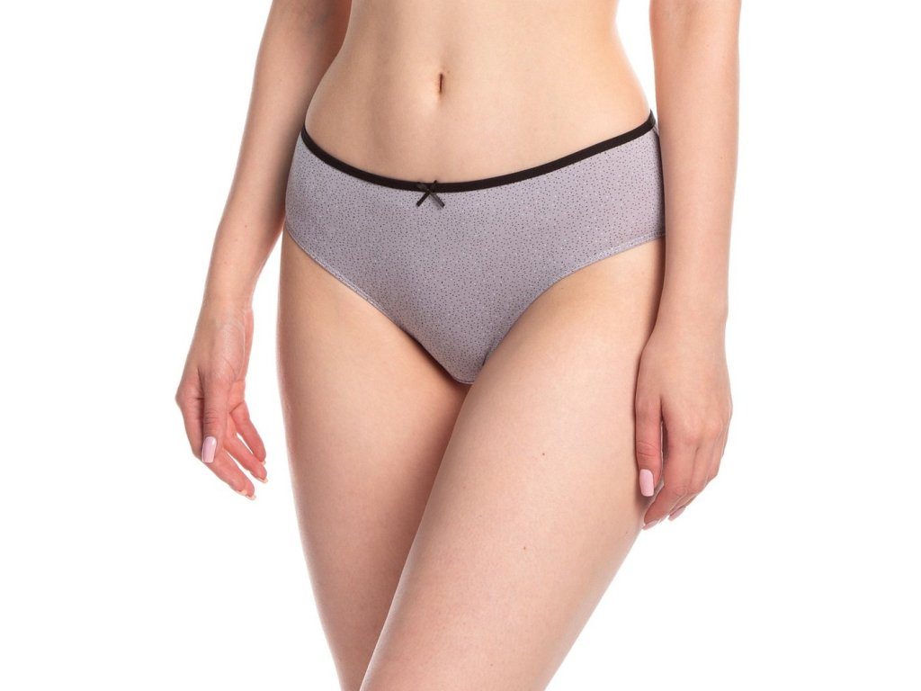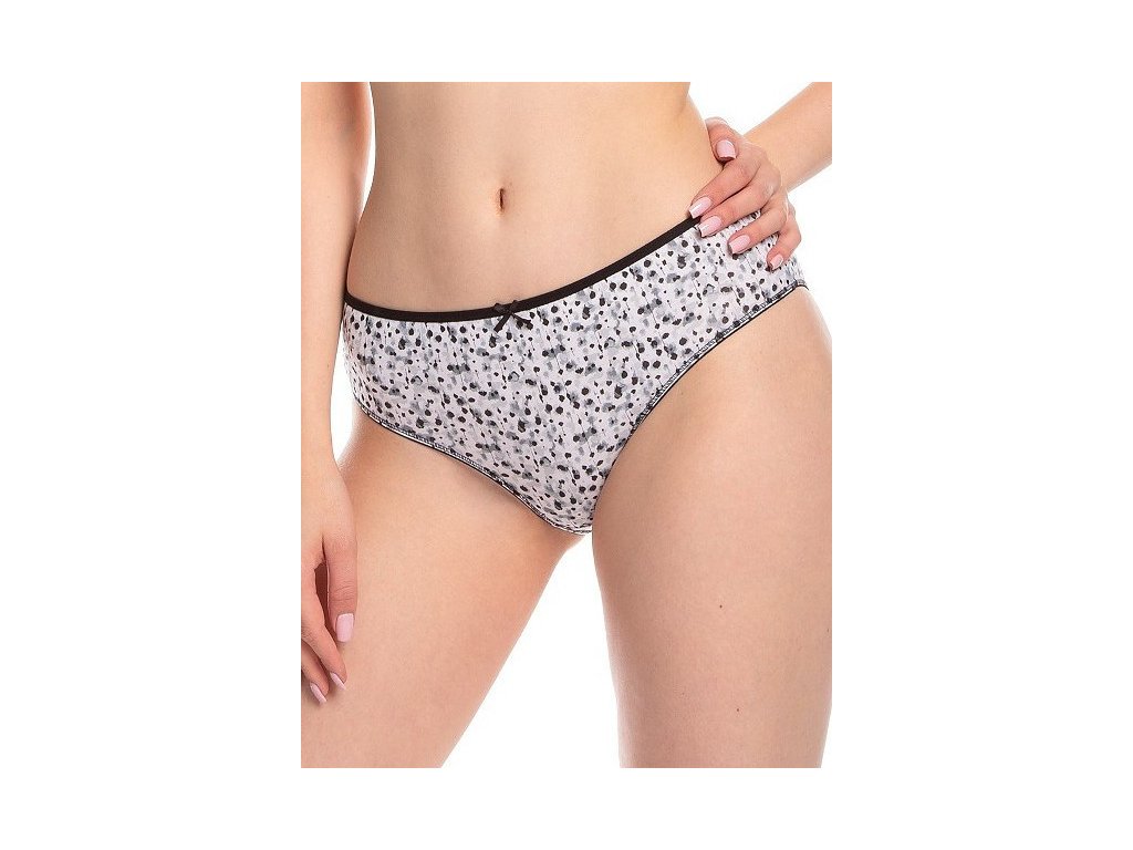 Bavlněné dámské kalhotky s plnějšími boky.Model má v pase plochou gumu a mašličku. Kalhotky jsou balené ve fóliovém sáčku po třech kusech - dva kusy jsou vzorované a jeden je jednobarevný.