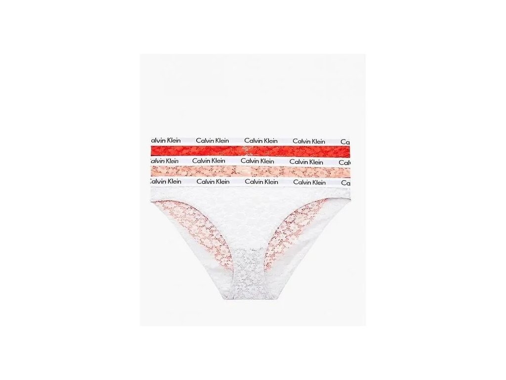 Krajkové kalhotky bikini 3-pack Calvin Klein Součástí balení jsou 3 kusy kalhotek - červené, fialové a modré. Originální krajkový vzor s ikonickým logem CK.
