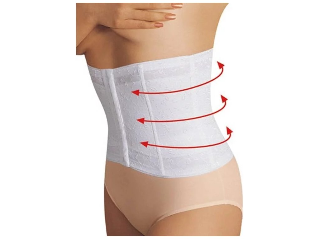 Korzet ve tvaru pásu, který stahuje břišní a bederní partie, a tím modeluje linii postavy. Dokáže zmenšit obvod o jeden rozměr, tedy až o 4 cm!!! Dokonale podepírá dolní část páteře díky využití zvláštního druhu výztuže. Je vyroben ze dvou vrstev tkaniny: vnější - modelující a vnitřní - bavlněné, která je příjemná na tělo. Celkově je velmi elegantní a současně praktický. Materiálové složení: 82 % polyamid, 18 % elastan.