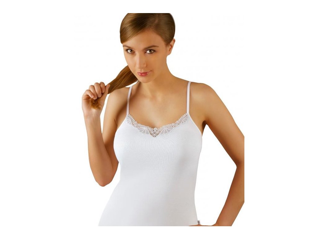 Dámské tílko s úzkými ramínky je vyrobené z příjemné bavlny (100%). Dekolt je zdobený všitou krajkou.