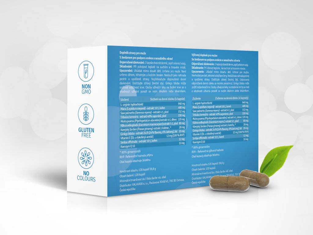 Složení v denní dávce (4 kapsle): L-arginin hydrochlorid 640mg, Maca (Lepidum meyenii)- extrakt 10:1, kořen 480mg, Saw palmetto (Serenoa repens) – extrakt 4:1, plod 152mg, Tribulus terrestris – extrakt 40% saponinů, plod 150mg, Muira puama (Ptychopetalum olacoides) extrakt 4:1, dřevo 120mg, Klikva velkoplodá (Vaccinium macrocarpon) extrakt 5:1, plod 80mg, Korejský ženšen (panax ginseng) extrakt z kořene, 80% ginsenosidů 28mg, Ginkgo biloba – extrakt 24/6 (24%flavony, 6% laktony), list 20mg, Vitamin E (DL – a – tokoferyl – acetát) 12mg (100% RHP), Smilax officinalis – extrakt 10:1, kořen 12mg, Koenzym Q 10 10mg