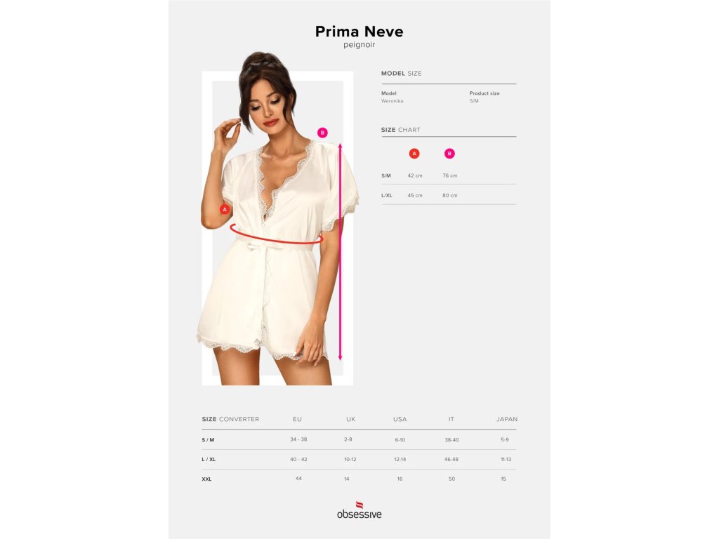Prima Neve PeignoirCo si myslíš o vhodném překvapení? Stuha místo pásku plus jemný saténový materiál se podle dokonalého vzorce rovná... nezapomenutelné dny a noci! Nechte se zlákat krajkovými rukávy a jednoduchým stylem županu Prima Neve! Zavřete oči a představte si, jaká bude reakce vašeho milovaného, & #8203 & #8203 když se před ním tomto kousku objevíte.