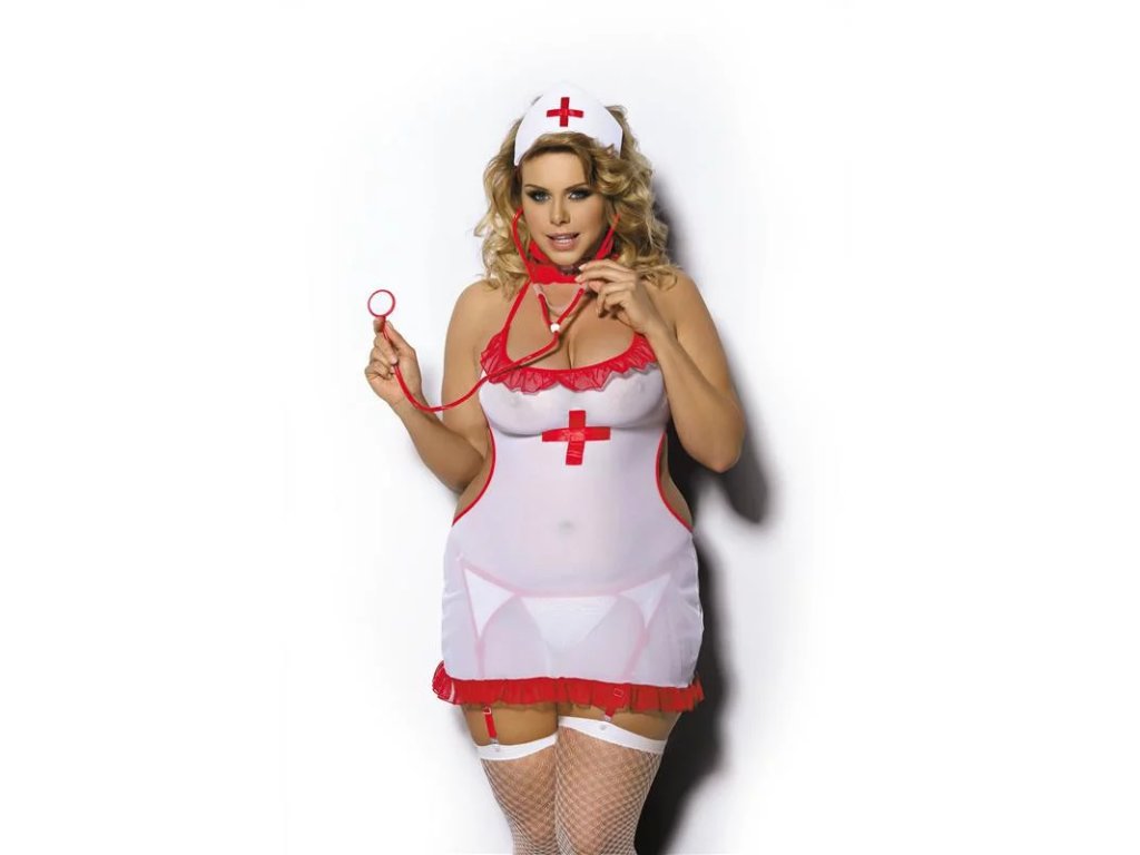 Naprosto skvělý komplet Shane z nejnovější kolekce Gorgeous +, který je určen ženám nosícím velikost plus size. Podmanivý kostým svůdné zdravotní sestřičky na místě postaví zpět na nohy nejednoho pacienta, který se nachází v domácím ošetření. Sněhově bílá průhledná košilka s charakteristickým střihem, hluboký výstřih zkrášlený výrazným emblémem zdravotní služby, kouzelným volánkem a praktickou regulací na šíji, která zajišťuje ideální přizpůsobení a vkusné zdůraznění ňader. V kompletu: košilka, tanga s pasem do punčoch,čepice. Punčochy a stetoskop není součástí balení.Materiálové složení: 80% polyamid, 20% elastan