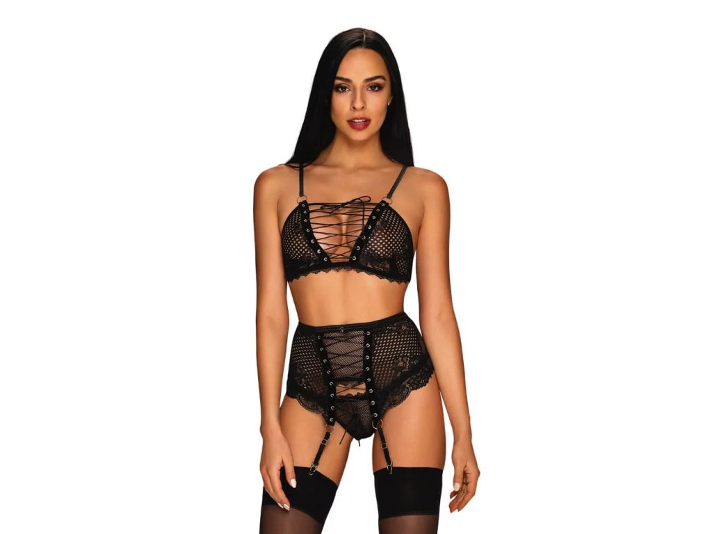 Sada BasittaChcete se vrhnout do něčeho koketního a podmanivého? Oblékněte si jedinečnou černou síťovinu a nechte se ohromit nevšedními ozdobami! Pod pojmem neobyčejné se skrývá něco víc... rozkošné korzetové vázání a kovové kroužky. Basitta je souprava, kterou budete chtít nosit každý den!