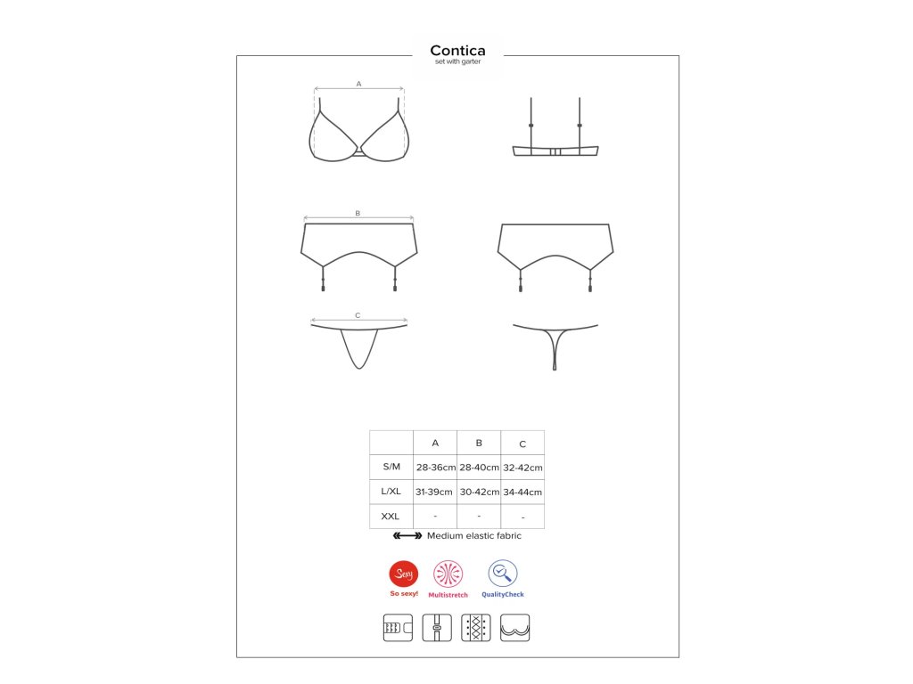 Set ConticaPohodlná podprsenka s nastavitelnými pásky a zapínáním, zapadající do krajkového podvazkového pásu a tanga - to je sexy sada Contica. Zdůrazněte své křivky na vyšší level, aby z vás nemohl strhnout oči. Nebudete se moct dočkat až se setmí.