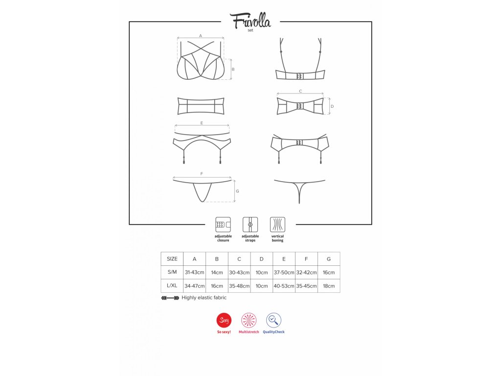 Neuvěřitelně nádherný a svůdný set. Pokryje vaše tělo dokonale jemnou krajkou s hravými proužky – od krku až po hýždě. Seznamte se s Frivolla setem! Čtyři obdivuhodné kousky prádla k vám přichází se svým zvláštním kouzlem. Naprosto jedinečný design s koketní krajkou a pásky vám umožní stát se sexy svůdnicí. Takže? Stačí jen obléci a prožít ty vzrušující chvíle, které na vás čekají!